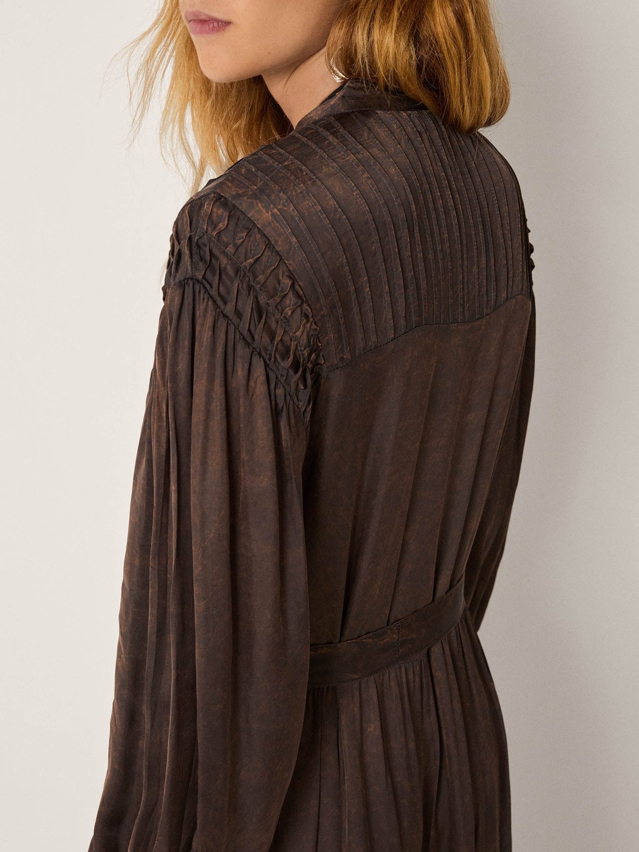 The fabric falls with weight yet no bulk, tiered into generous panels that move easily with air. Smocking across the shoulders adds comfort while giving a subtle textured detail.